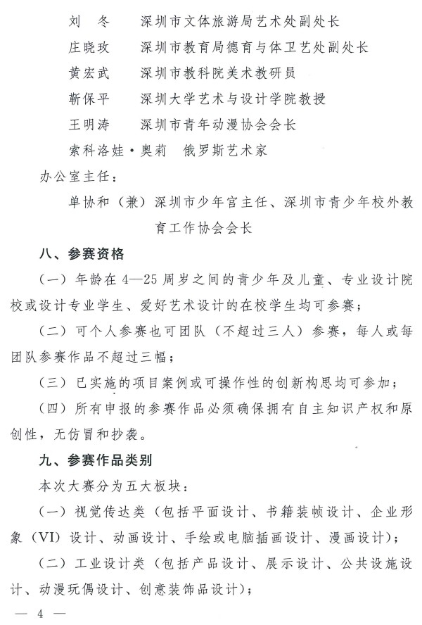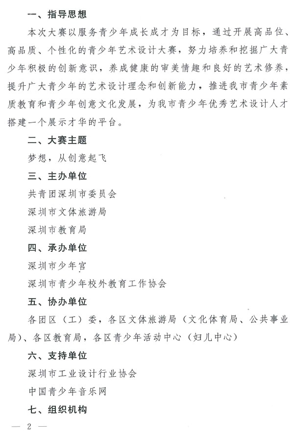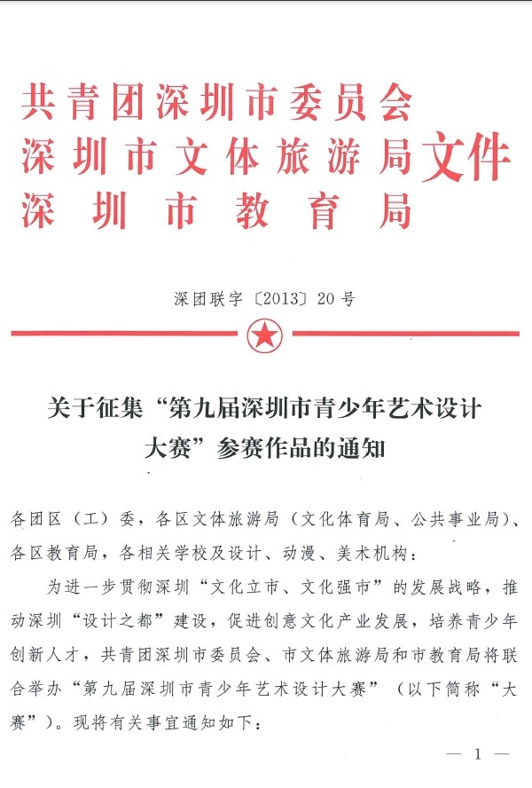 为进一步贯彻深圳“文化立市、文化强市”的发展战略,推动深圳“设计之都”建设,促进创意文化产业发展,培养青少年创新人才, 共青团深圳市委员会、市文体旅游局和市教育局将联合举办“第九届深圳市青少年艺术设计大赛”(以下简称“大赛”)。现将有关事宜通知如下: