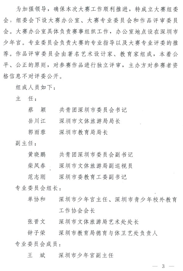 为加强领导,确保本次大赛工作顺利推进,特成立大赛组委会,组委会下设大赛办公室、大赛专业委员会和作品评审委员会。大赛办公室具体负责赛事组织工作,办公室地点设在深圳市少年宫。专业委员会负责大赛的专业指导以及大赛专业评委的推荐。作品评审委员会由著名艺术设计家、教育家组成,本着公平、公正的原则,对参赛作品进行独立评审,主办方对参赛者资格信息不对评委公开。