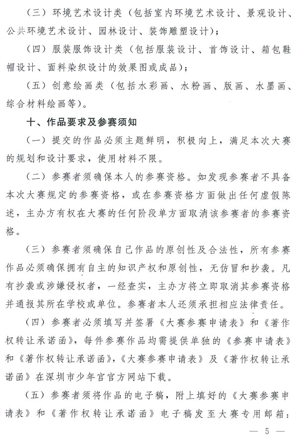 (四)参赛者必须填写并签署《大赛参赛申请表》和《著作权转让承诺函》,每件参赛作品均需提供单独的《参赛申请表》和《著作权转让承诺函》,《大赛参赛申请表》及《著作权转让承诺函》在深圳市少年宫官方网站下载。