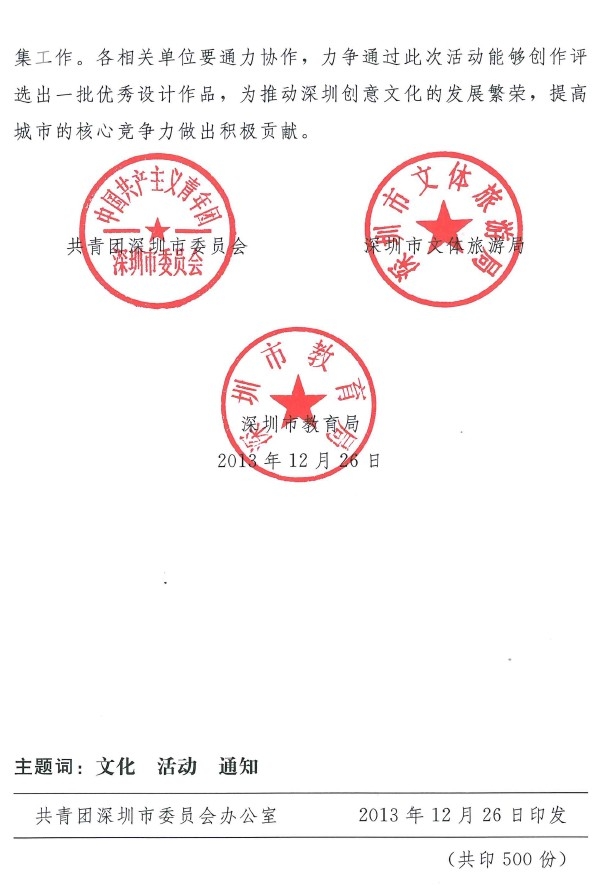 (三)加强分工合作,提高工作成效。各相关单位负责组织青少年报名参赛;市少年宫美术基地负责接受报名登记与作品收集工作。各相关单位要通力协作,力争通过此次活动能够创作评选出一批优秀设计作品,为推动深圳创意文化的发展繁荣,提高城市的核心竞争力做出积极贡献。