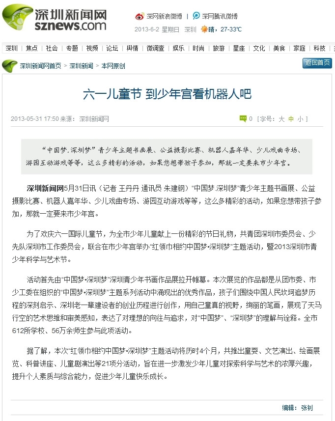 〖深圳新闻网〗六一儿童节 到少年宫看机器人吧