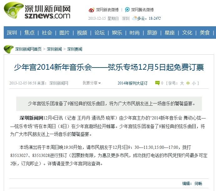 〖深圳新闻网〗少年宫2014新年音乐会——弦乐专场12月5日起免费订票