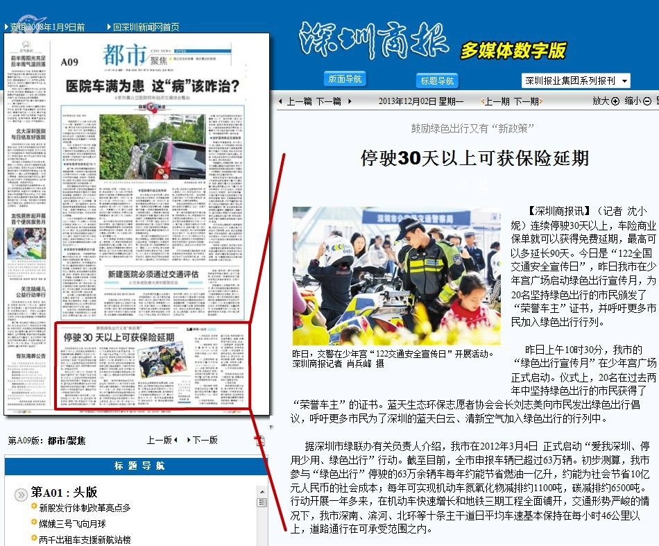 据悉, “持续开展绿色出行行动”已经列入市政府2013年下半年及未来两年治理交通拥堵的25项政策和措施之一。今年11月,绿联办成员单位深圳公安交警局和深圳保监局共同与深圳保险同业公会达成保险费用优惠方案:对申报绿色出行连续停驶30天以上的车主,自2014年5月1日至2015年4月30日期间可以到保险公司办理商业车险合同期限的免费延期。也就是说,在这期间内商业车险到期的市民,只要在此前连续停驶过30天以上,就可以申请保单延期。连续停驶多少天保单就免费顺延多少天,最长不超过90天。这一做法在全国尚属首家,因此将试行一年,具体的操作细则尚在商议中。