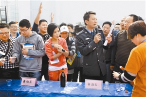 交警演示酒后驾车酒精浓度检测。