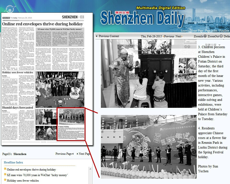 Children perform at Shenzhen Children’s Palace in Futian District on Saturday, the third day of the first month of the lunar new year. Various activities, including performances, interactive games, riddle-solving and exhibitions, were held at Children’s Palace from Saturday to Tuesday.