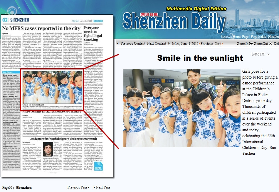 Girls pose for a photo before giving a dance performance at the Children’s Palace in Futian District yesterday. Thousands of children participated in a series of events over the weekend and today, celebrating the 66th International Children’s Day. Sun Yuchen