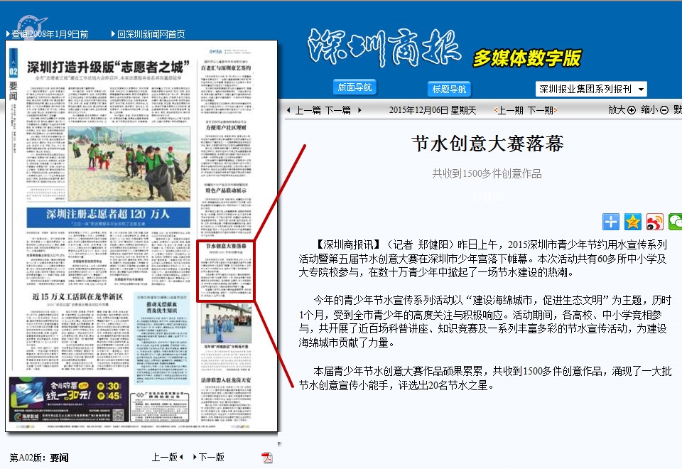 【深圳商报讯】(记者 郑健阳)昨日上午,2015深圳市青少年节约用水宣传系列活动暨第五届节水创意大赛在深圳市少年宫落下帷幕。本次活动共有60多所中小学及大专院校参与,在数十万青少年中掀起了一场节水建设的热潮。
