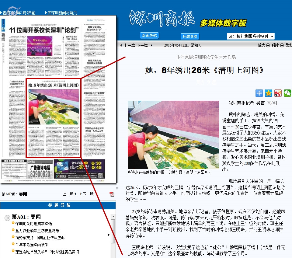 《清明上河图》一点点趋于完整,王老师和陈诗琪都充满了信心。但是去年,陈诗琪的父亲因为不堪生活重任,离家出走,音讯全无,只剩下母女俩相依为命。陈诗琪想念爸爸,痛苦地“罢工”,不肯再绣,甚至用手把自己的脸都抓破了。王老师闻讯赶到肇庆,抱着陈诗琪安慰她鼓励她……在向记者叙述这段经历时,王老师几欲落泪,而言语间,她早已经将陈诗琪称为“宝宝”。