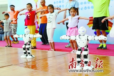 6月1日下午2点30时,今年春晚赚足眼球的阿尔法机器人在深圳市少年宫炫彩亮相。阿尔法机器人的到来吸引了大批家长带着小孩前往观看,阿尔法机器人劲歌热舞,赢得大人小孩的阵阵尖叫。光是跳舞不过瘾,主持人还邀请小朋友上台和阿尔法机器人现场“比舞”,从简单的俯卧撑、单手撑,再到曼妙的舞步,小朋友玩得不亦乐乎。 南方日报记者 朱洪波 摄影报道