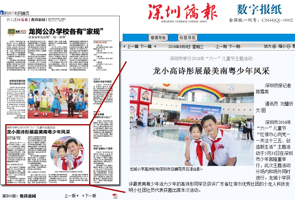 深圳市2016年“六一”儿童节“红领巾心向党——关注十三五、创造新生活”主题活动于5月31日在深圳市少年宫隆重举行,此次主题活动分场内和场外同时进行。龙城小学获评最美南粤少年活力少年的高诗彤同学及获评广东省红领巾优秀社团的小龙人科技发明小社团社员代表获邀出席本次活动。
