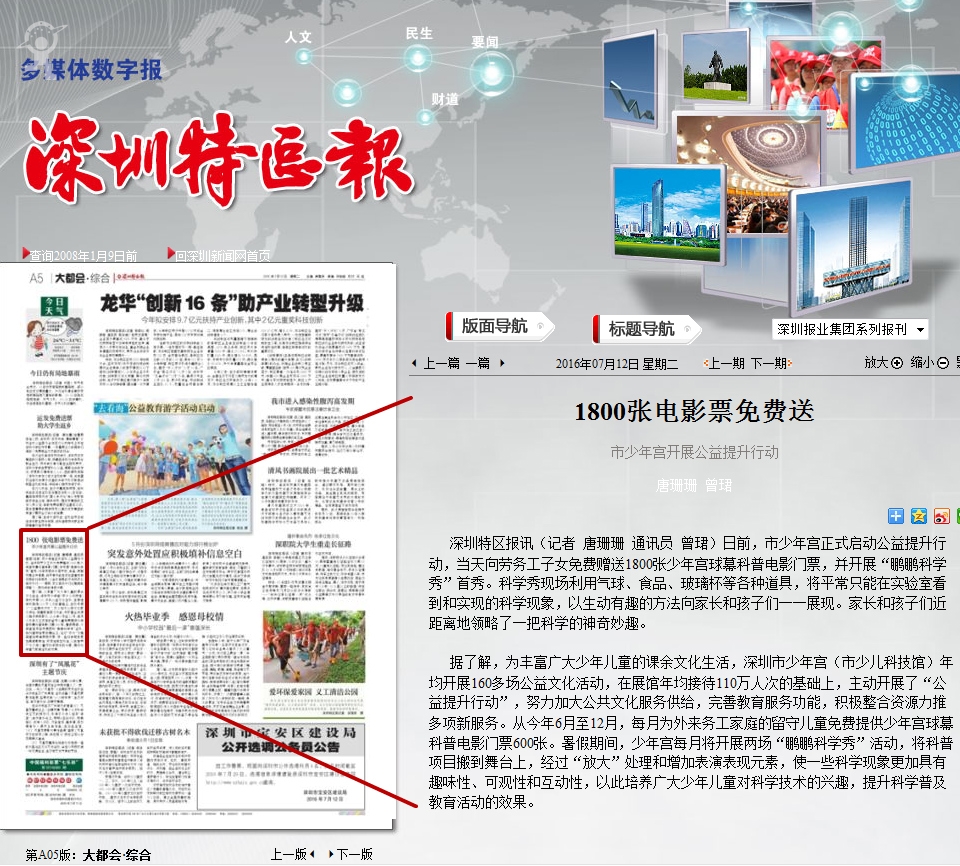 据了解,为丰富广大少年儿童的课余文化生活,深圳市少年宫(市少儿科技馆)年均开展160多场公益文化活动,在展馆年均接待110万人次的基础上,主动开展了“公益提升行动”,努力加大公共文化服务供给,完善教育服务功能,积极整合资源力推多项新服务。从今年6月至12月,每月为外来务工家庭的留守儿童免费提供少年宫球幕科普电影门票600张。暑假期间,少年宫每月将开展两场“鹏鹏科学秀”活动,将科普项目搬到舞台上,经过“放大”处理和增加表演表现元素,使一些科学现象更加具有趣味性、可观性和互动性,以此培养广大少年儿童对科学技术的兴趣,提升科学普及教育活动的效果。