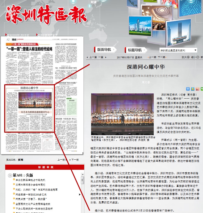 深圳特区报讯(记者 周元春) 昨晚,“同心耀中华”—— 庆祝香港回归祖国20周年深港青年文化交流艺术季在深圳少年宫少儿剧场开幕。接下来两个月,深港两地青年将联袂为两地市民献上多场高水准的表演。