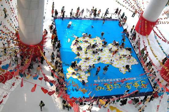 在少年宫水晶大厅中央,铺着一张巨幅的中国地图,众多小画家在地图上现场共同做画,用不同的色彩描绘自己心中的梦想和对祖国的祝福。每个画面都设计成“心型”图案,在巨大的地图上,“心”越集越多,气氛逐渐升温。在活动现场,还有三颗巨大的许愿树,树上挂满祝福祖国的许愿卡,儿童在卡上现场作画,完成后挂在许愿树,整个大厅挂满许愿卡,场面热烈。   。