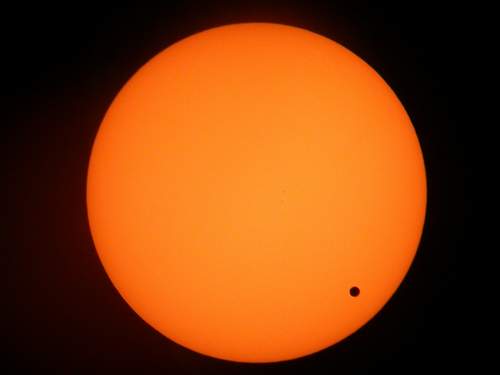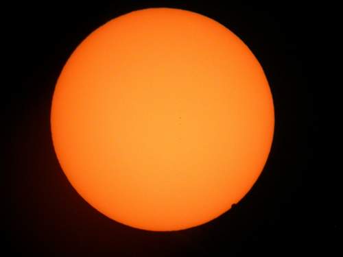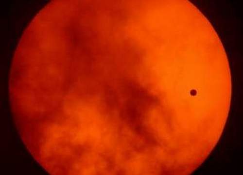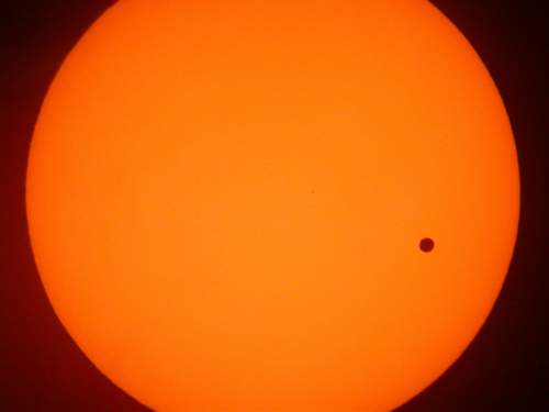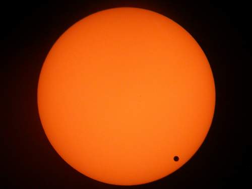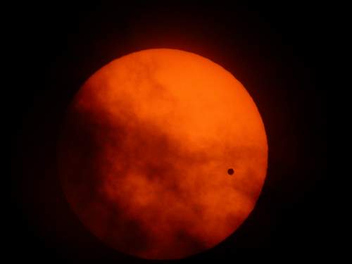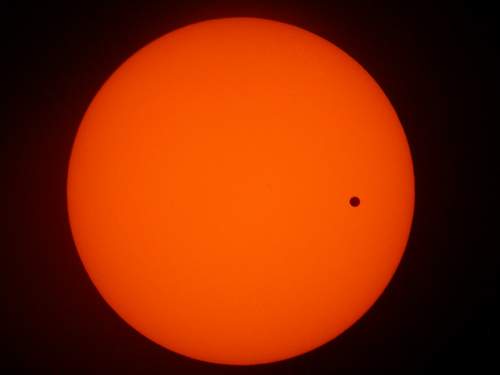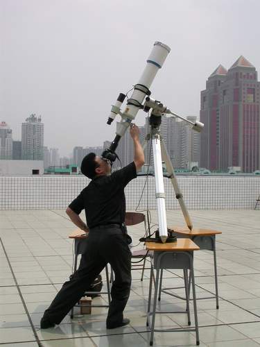 一大清早,少年宫的徐老师便把高倍的专业望远镜调试好,中午不到一点钟,大家便纷纷集合到莲花中学教学楼顶的观测现场,虽然其时是个晴间多云的酷热天气,飘忽的云朵增加了观测的难度,但这些并没有减弱同学们的兴致,大家翘首以待,捕捉下一个个珍贵的镜头,气氛非常热烈。从望远镜中看到的太阳犹如一个金黄色的圆盘,而金星则只是一个圆圆的小黑点,慢慢地从太阳的东南方向切过。