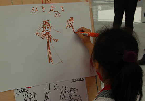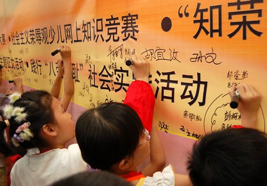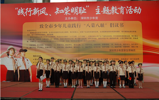 在此之前,少年宫已经围绕社会主义荣辱观,开展了如社会主义荣辱观网上知识竞赛、“八荣八耻”连环画创作活动、“知荣明耻,自我成长”学习活动周等一系列主题活动,务求以更多、更新、更容易让孩子接受的形式,在孩子当中进行社会主义荣辱观教育,取得了非常好的效果。据少年宫主任梁毅介绍,少年宫围绕社会主义荣辱观,针对少年儿童开展的主题教育活动,有两大显著特点:一是充分考虑了孩子们的内心真实意愿,融入了更多让孩子自主参与的元素。比如,领袖团的团员们通过深入学习后,自发组织起来,自主设计活动、撰写倡议书,自觉向身边的小朋友们宣传等就是一例。二是充分考虑了孩子的兴趣特点,采取了如漫画创作、知识竞赛等孩子感兴趣的方式进行教育,体现了寓教于乐的教育原则。