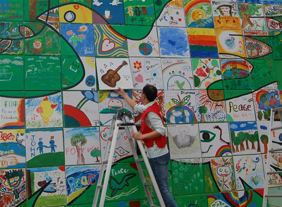 当130余幅图画完成后,活动主办者将这些作品在大厅的巨大墙面上排列组合成一幅高5米宽10米的一只衔橄榄枝的和平鸽画面。据介绍,这幅象征六国和平友好的巨幅画作将由市少年宫保存。