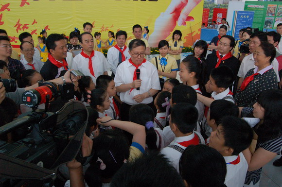 上午9点,李鸿忠一行冒雨来到少年宫。刚走进水晶宫大厅,孩子们立刻欢呼雀跃地围了上来,争相给市领导们戴上鲜艳的红领巾。拉着孩子们的手,在学生讲解员的带领下,李鸿忠等兴致勃勃地参观起了全市六区和各学校开展少先队活动的主题展板。