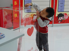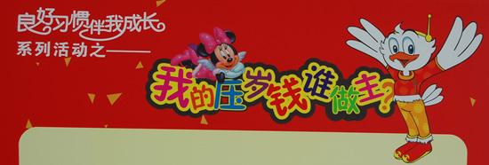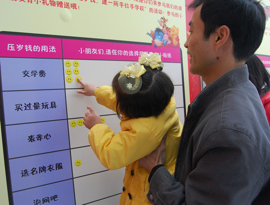 放置在少年宫一楼水晶石大厅的展板用卡通人物“鹏鹏”的口吻跟小朋友们讲压岁钱的故事,活泼有趣,充满了过年热闹和喜庆的气氛,紧紧吸引了孩子和家长的目光。活动内容包括:新年贺信、压岁钱小知识、压岁钱谁掌握、实话实说压岁钱、压岁钱怎么花、“鹏鹏”对爸爸妈妈说、“鹏鹏”向小朋友的倡议、捐一元压岁钱建一所手拉手学校、看一看选一选现场互动环节等。活动用漫画这种直观的形式开展思想道德教育,并充分展示了团市委“捐一元压岁钱建一所手拉手学校”活动的成果,让孩子通过参与、思考和讨论,深刻领会大人给“压岁钱”的良苦用心。同时,这也是对家长的一种教育,希望通过这样的活动,鼓励家长合理派发“利是”,积极引导孩子形成健康的理财习惯,树立正确的金钱观、人生观。