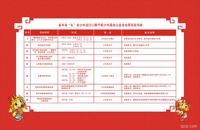 值2012年新春之际,深圳市少年宫将继续举办“新年有‘礼’——市少年宫2012春节青少年服务公益活动周”活动。