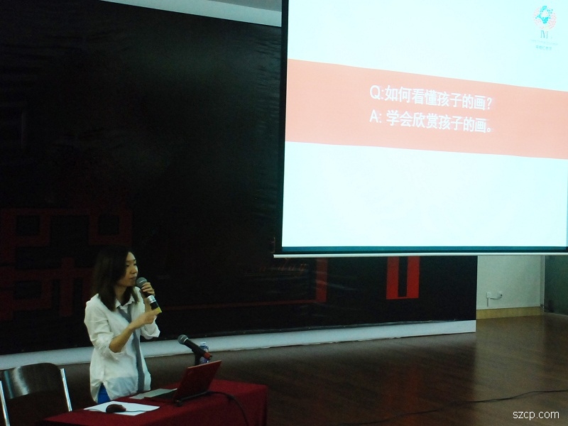 沈老师总结了多年的教学经验,使用七年教学中积累下来的大量学生作品图片,与家长们探讨了如何提升孩子绘画的造型与用色技巧、如何欣赏孩子的作品、如何正确鼓励孩子、如何给孩子提意见等问题。