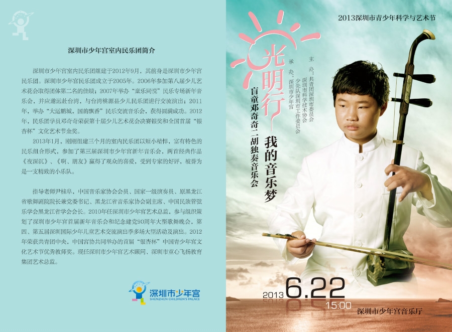 由共青团深圳市委员会、深圳市科学技术协会、少先队深圳市工作委员会联合主办,深圳市少年宫承办的“2013深圳青少年科学与艺术节”——“光明行”我的音乐梦盲童邓奇奇二胡独奏音乐会将于6月22日下午15:00在少年宫三楼音乐厅隆重上演。部分演出门票将向喜爱民族音乐艺术的少年儿童免费发放,市民可拨打热线83513027,83513028预约登记,订票时间为6月14日,接受订票工作时间为:上午9:30-11:30,门票数量有限,订完即止。