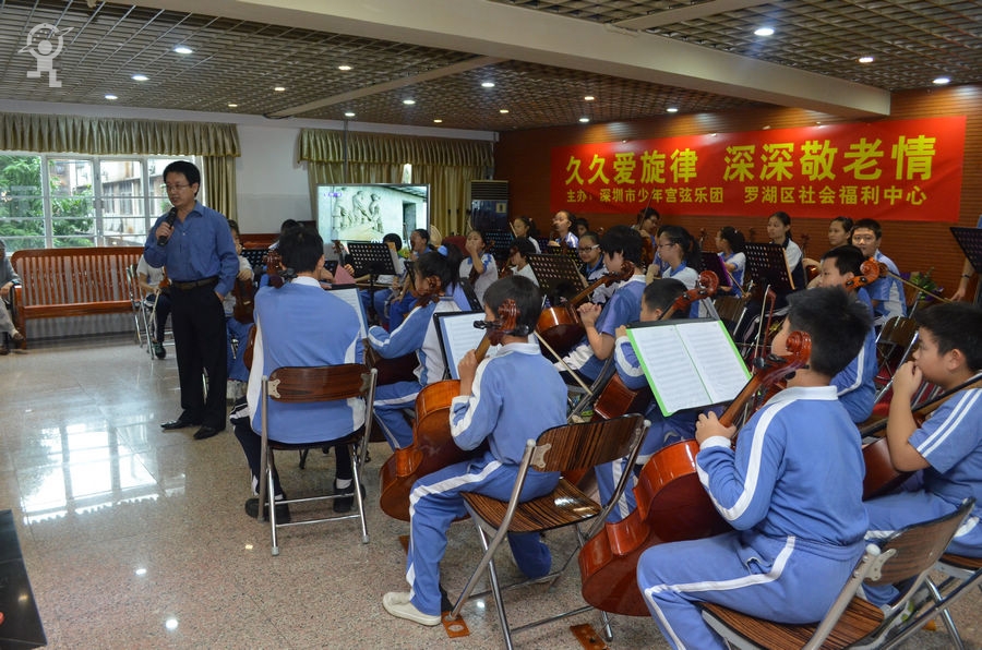 为了弘扬中华民族敬老爱老的优良传统,培养青少年儿童爱心和孝心,2013年11月10日上午,深圳市少年宫弦乐团组织40名演出团学员前往罗湖区社会福利中心,开展了“久久爱旋律,深深敬老情”少年儿童社会实践活动。