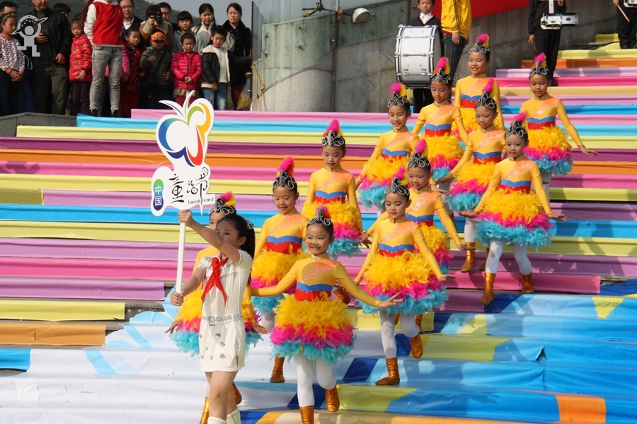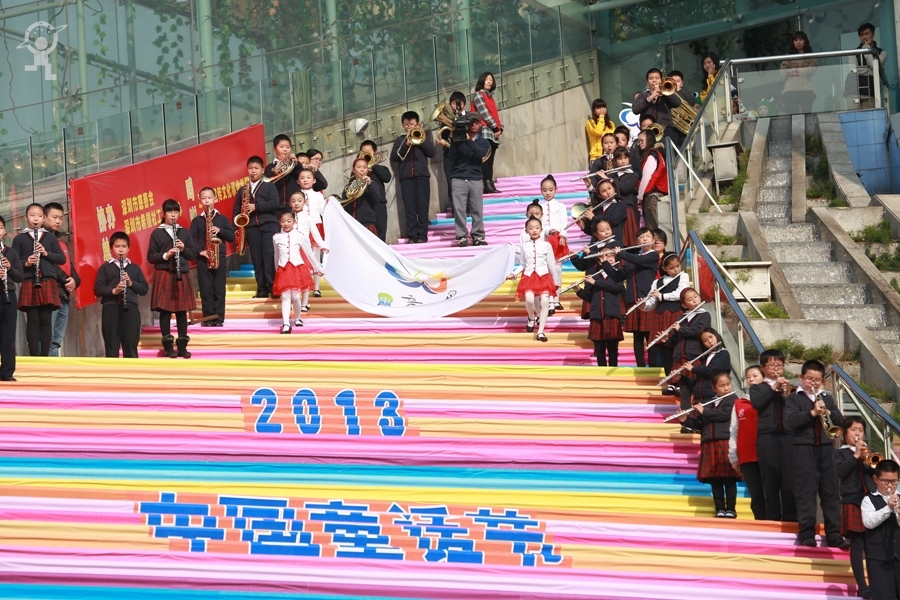 活动当天,随着一声声号角的吹响和一阵阵锣鼓的节奏,一群群天真可爱的孩子们从少年宫外围阶梯缓缓走下,他们是童话节比赛中优秀团队的代表,分别来自合唱、群舞、中英文短剧表演大赛中的参赛队伍。每一位孩子都华服盛装,踏着欢乐的音乐节拍出场游行、造型亮相,全程围绕着少年宫西广场行走,最终完成大巡游。