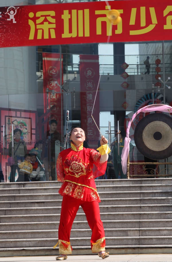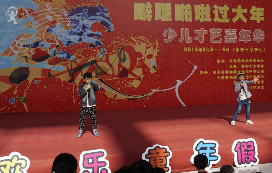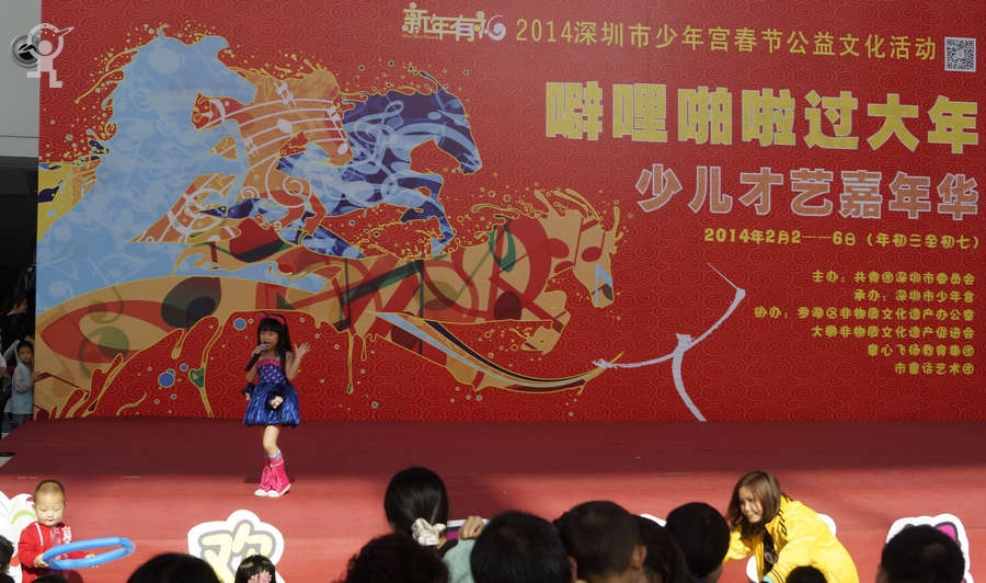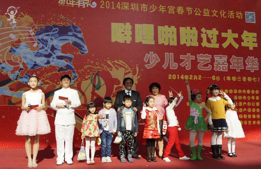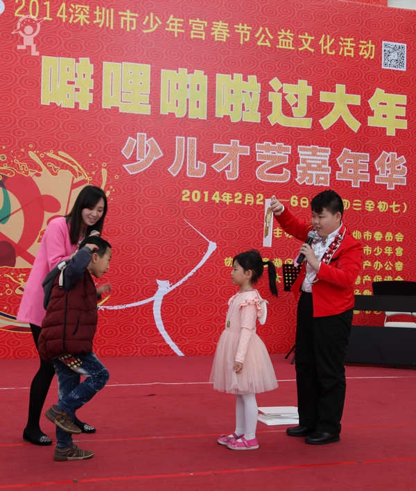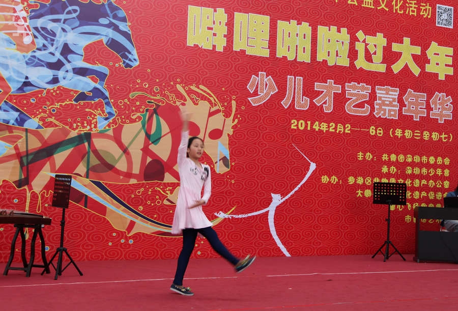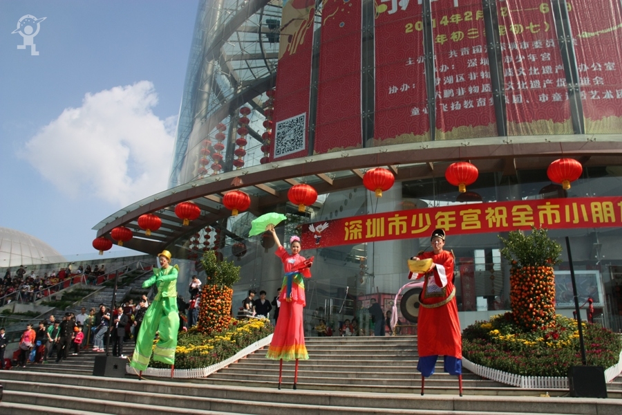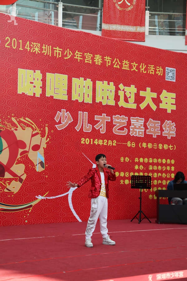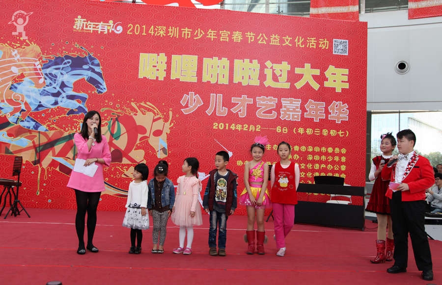 农历大年初三上午,艳阳高照,少年宫广场载歌载舞,热闹非凡,一派欢乐喜庆、红红火火的节日景象。团市委书记蔡颖给家长小朋友亲切拜年,随后,新年有“礼”——2014深圳市少年宫春节公益文化活动拉开了序幕。在年初三到年初七的5天时间里,民俗项目表演、公益演出、参观体验、微信猜谜等丰富多彩的活动将为市民朋友献上丰盛的新年大餐。