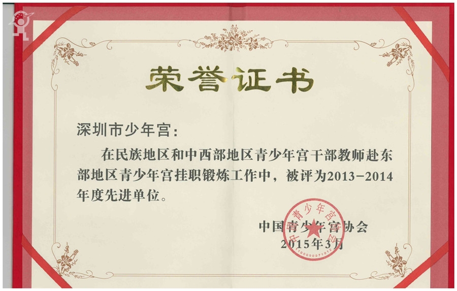 中国宫协于2012年至2014年组织开展了民族地区和中西部地区青少年宫干部教师赴东部地区青少年宫挂职锻炼工作,在派出、接收单位和挂职干部的大力支持下,取得了较大的成绩。为了总结工作经验,进一步做好挂职锻炼工作,中国宫协对工作积极、成绩突出的先进单位和个人予以表彰,我宫荣获“先进单位”称号。