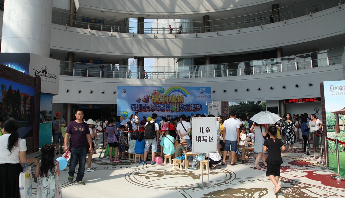 52829日, 六一儿童节前夕,深圳市少年宫的水晶石大厅俨然成为了一片欢乐的海洋,洋溢着热烈的节日气氛。在这里,深圳市少年宫与香港迪士尼乐园合作,举办了为期两天的亲子嘉年华活动。活动以“探索”为主题,在水晶石大厅中央区域设置了“迪士尼朋友”、“漫威超级英雄”、“探索家大召集”、“主题园区配对”、“探索奇妙骰”、“填色游戏”等六大不同主题的游戏区。喜闻乐见的游戏项目吸引了众多小朋友和家长的热情参与,孩子们在在迪士尼玩偶的陪伴下共度了端午节假期的快乐时光,并提前感受了六一儿童节的快乐氛围。