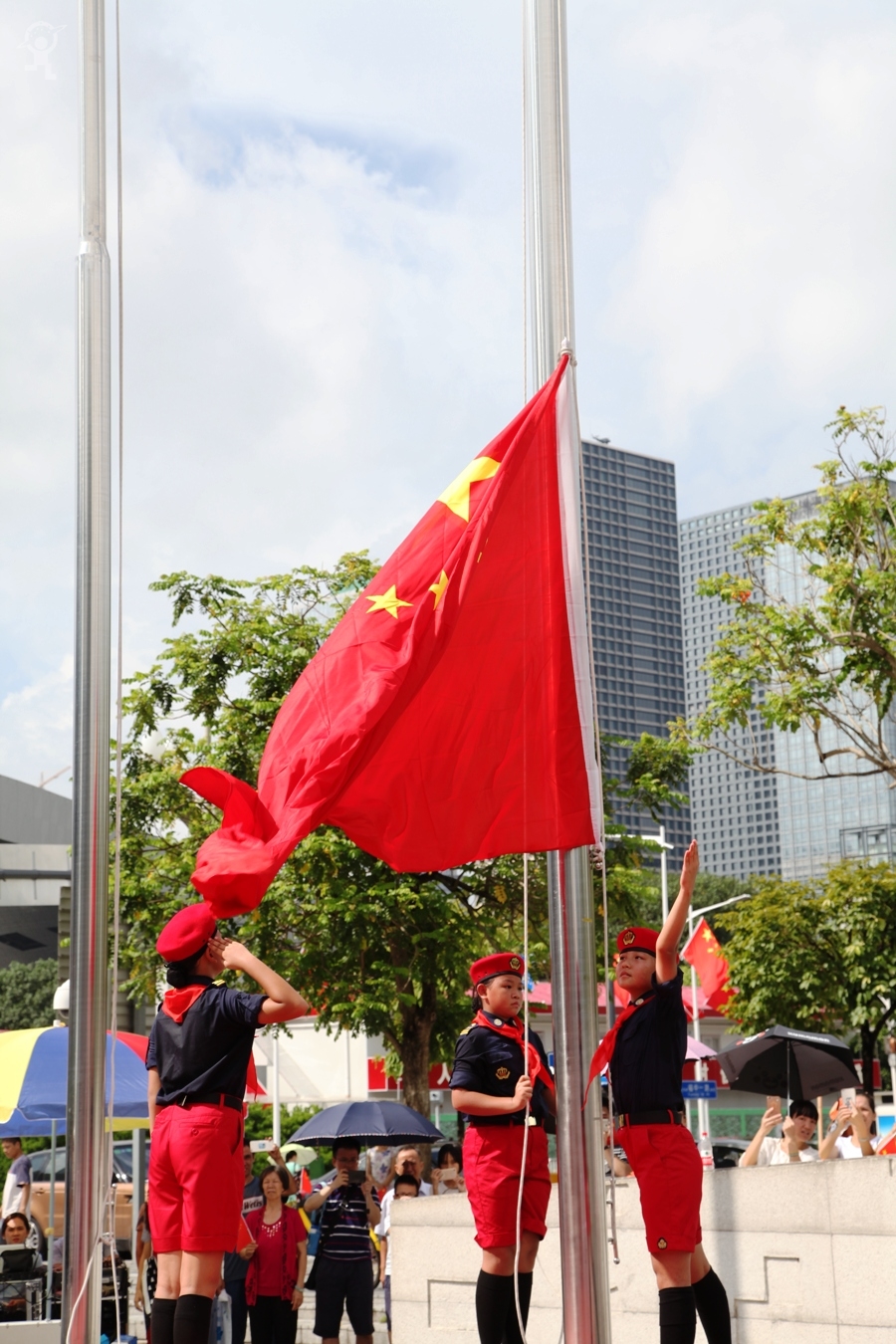 迎着朝阳,来自福田区教科院第二附属小学的升旗队伍护送国旗来到国旗旗杆前,在将国旗抛向天空的瞬间,广场上近千名群众肃穆地抬起头,全神贯注地凝视着国旗行注目礼,口中大声齐唱雄壮激昂的国歌,在一片爱国热情澎湃的气氛中,五星红旗缓缓升起,在蓝天白云下迎风飘扬。