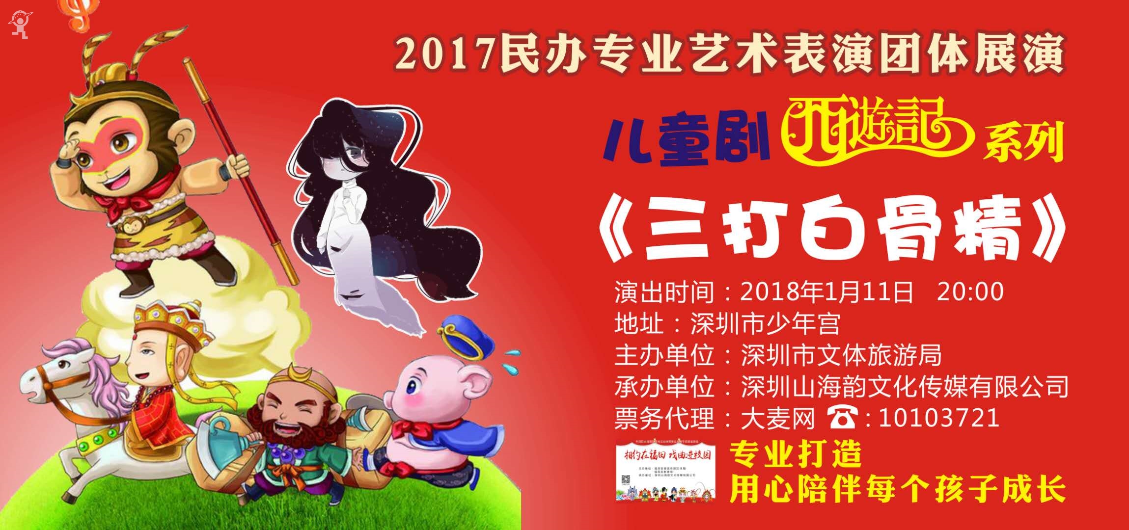 儿童剧《三打白骨精》由2017"相约在福田戏曲进校园"大型公益活动主负责单位深圳山海韵文化传媒有限公司重点打造,适合儿童观看。本剧目大胆创新,融入京剧元素,让孩子们观看的同时,也能领略中华五千年国粹文化。