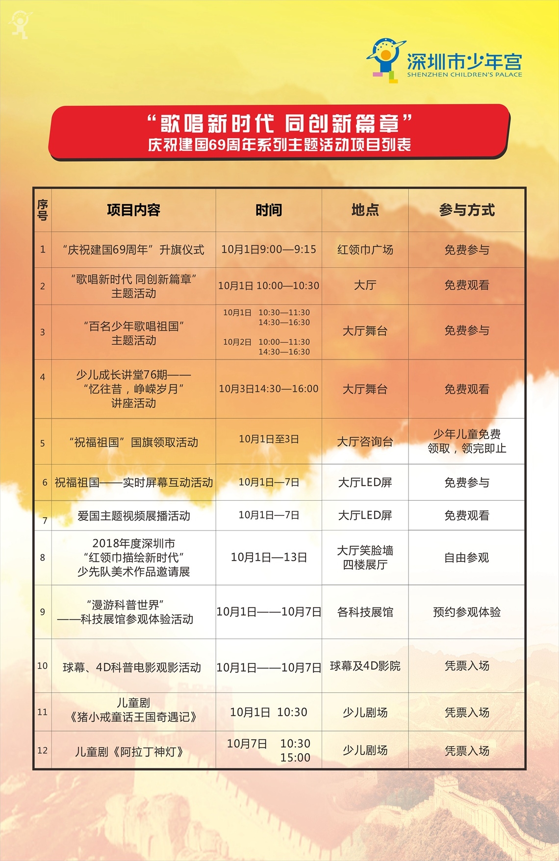 本系列活动包括升国旗仪式、“歌唱新时代、同创新篇章”“百名少年歌唱祖国”“忆往昔,峥嵘岁月”——少儿成长讲堂、“红领巾描绘新时代”少先队美术作品邀请展等十二项内容,将于101日至13日,在深圳市少年宫举行,欢迎全市家长及小朋友们参与。