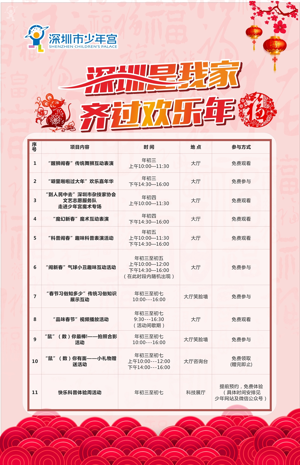 活动期间,少年宫大厅里将举办“闹新春”气球小丑趣味互动活动、“春节习俗知多少”传统习俗知识展示互动、“品味春节”视频播放活动、“鼠”(数)你最棒! ——拍照合影活动及“鼠”(数)你有面——小礼物赠送活动等;同时,在舞台上,还将举办“醒狮闹春”传统舞狮互动表演、“噼里啪啦过大年”欢乐嘉年华、“到人民中去”深圳市杂技家协会文艺志愿服务队走进少年宫魔术专场、“魔幻新春”魔术互动表演及“科普闹春”趣味科普表演活动等精彩纷呈的游戏、演出、互动活动。