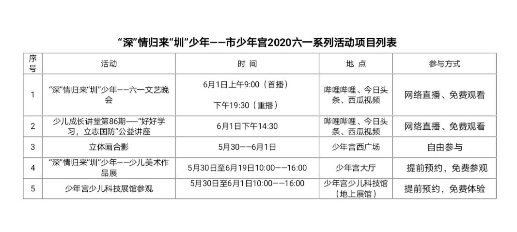 恰逢六一儿童节来临,市少年宫联合教学培训机构策划并推出了主题为:“深”情归来“圳”少年的六一系列活动。主要的活动项目包括:庆六一文艺晚会、美术作品展览、国防教育讲座、科技展馆参观体验等。鉴于疫情防控的需要,为确保少儿身体健康减少人群聚集,本次六一活动将采取线上网络直播和线下预约参观的方式,想要参与活动的家长和孩子们敬请留意活动时间和参与方式。深圳市少年宫提前预祝全体少年儿童节日快乐!