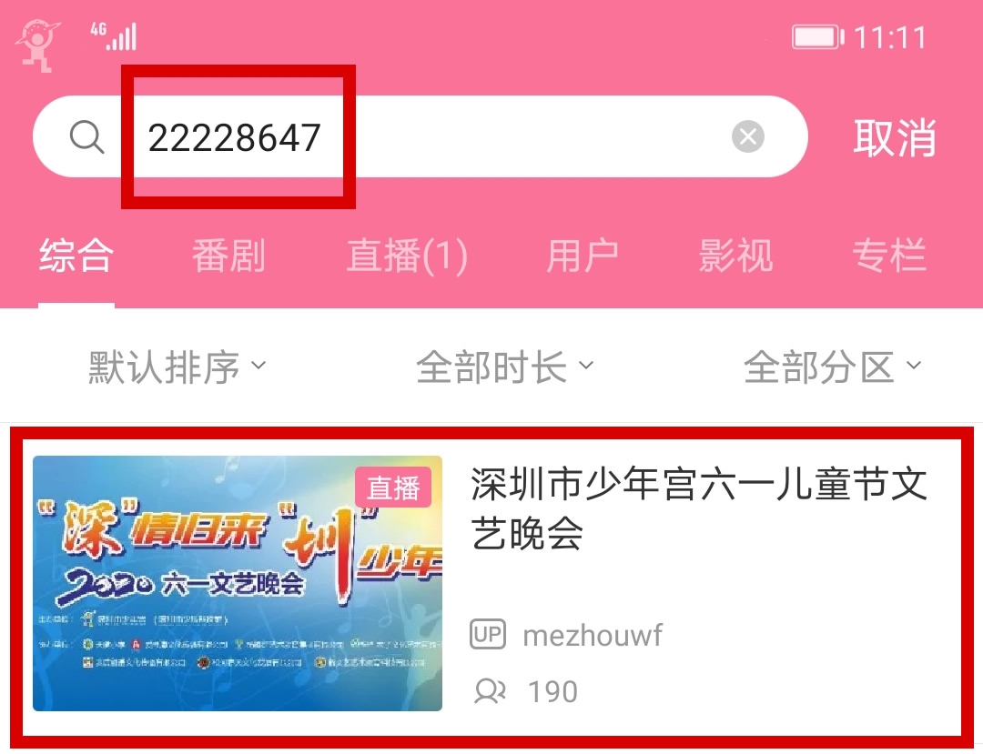 搜索:打开bilibili手机APP或登录www.bilibili.com网站,在搜索栏输入直播房间号22228647,选择六一文艺晚会直播链接点击进入观看。