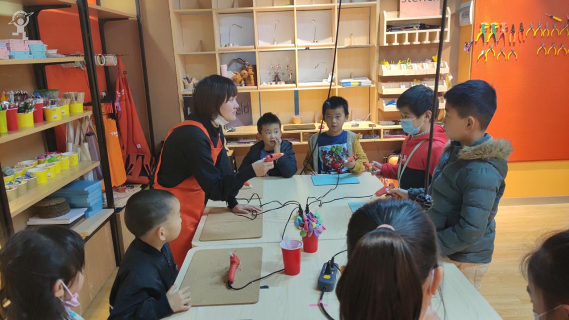 小米老师在给孩子们介绍热熔胶枪使用细则