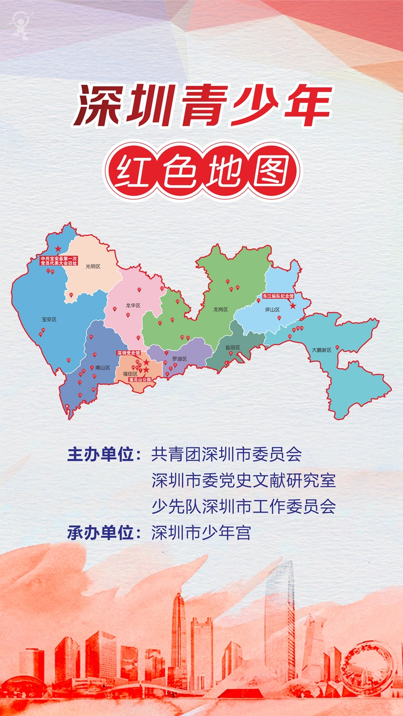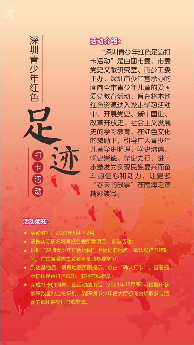 今年恰逢中国共产党建党一百周年,在“两个一百年”奋斗目标历史交汇的关键节点,深圳高标准高质量开展党史学习教育,作为市委党史学习教育的一项重要活动,由共青团深圳市委员会、深圳市委党史文献研究室、少先队深圳市工作委员会主办,深圳市少年宫承办的“深圳青少年红色地图”于六一期间正式发布,同步启动的还有“深圳青少年红色足迹打卡活动”。因疫情原因,主办方创新活动方式,采用“云发布”+“云学习”的形式,通过网络发布红色学习资源,号召广大市民及青少年儿童积极参与活动。活动希望将本地红色资源纳入四史学习活动中,引导广大青少年儿童学史明理、学史增信、学史崇德、学史力行,传承红色基因,赓续奋斗精神。