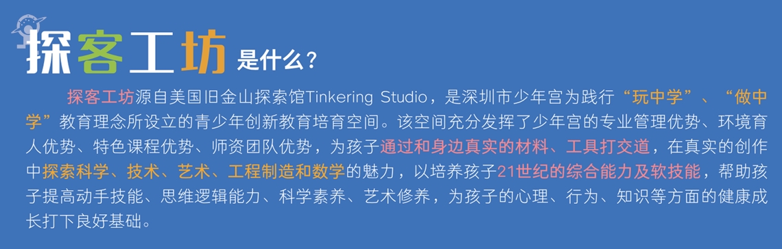 探客寄语:在5天的沉浸式学习中,老师将会协同“小小探客工程师”们通过自我探究式学习,在动手创造中,体会工程师的烧脑与严谨,在创建小小游乐园的过程中,探索机械的奥秘,了解力学、光学、齿轮传动等知识,用技术工具和科学原理表达自己的艺术观点、提升逻辑思维能力及培养解决问题的能力。