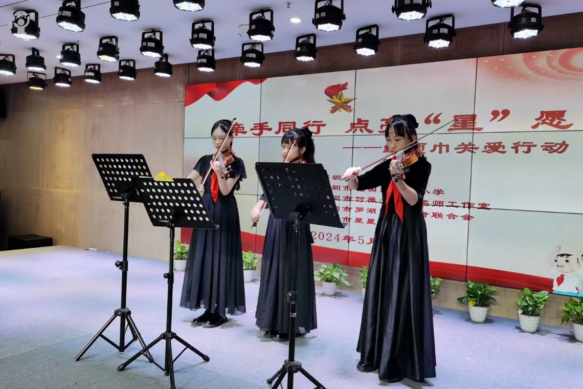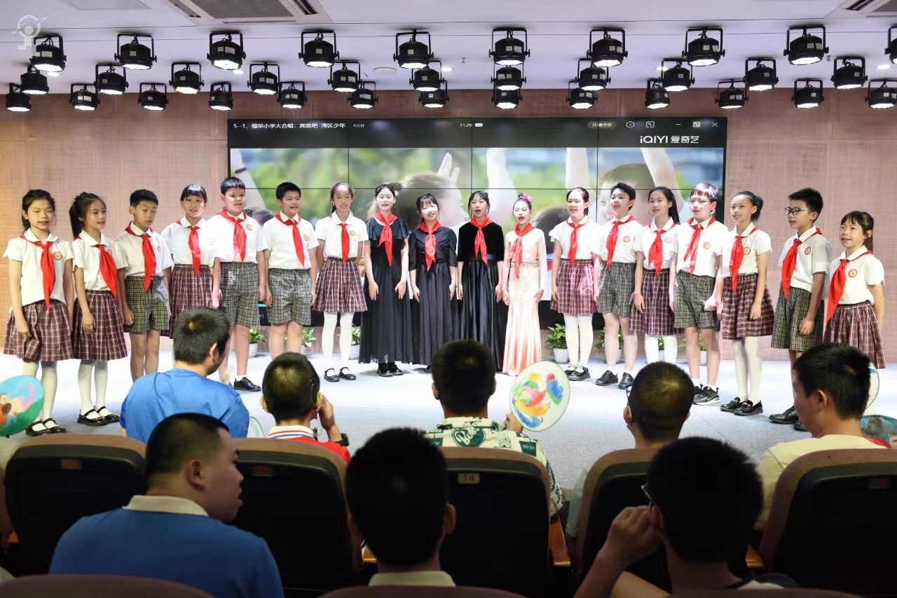 活动现场,少先队员与星星学堂的孩子共绘一幅画,共同完成提琴合奏《我和我的祖国》《红旗颂》,一同高声合唱《奔跑吧 湾区少年》。