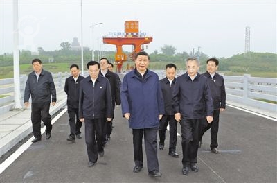 习近平首先来到陶岔渠首枢纽工程,实地察看引水闸运行情况,随后乘船考察丹江口水库,听取有关情况汇报,并察看现场取水水样。习近平强调,南水北调工程是重大战略性基础设施,功在当代,利在千秋。要从守护生命线的政治高度,切实维护南水北调工程安全、供水安全、水质安全。吃水不忘挖井人,要继续加大对库区的支持帮扶。要建立水资源刚性约束制度,严格用水总量控制,统筹生产、生活、生态用水,大力推进农业、工业、城镇等领域节水。要把水源区的生态环境保护工作作为重中之重,划出硬杠杠,坚定不移做好各项工作,守好这一库碧水。