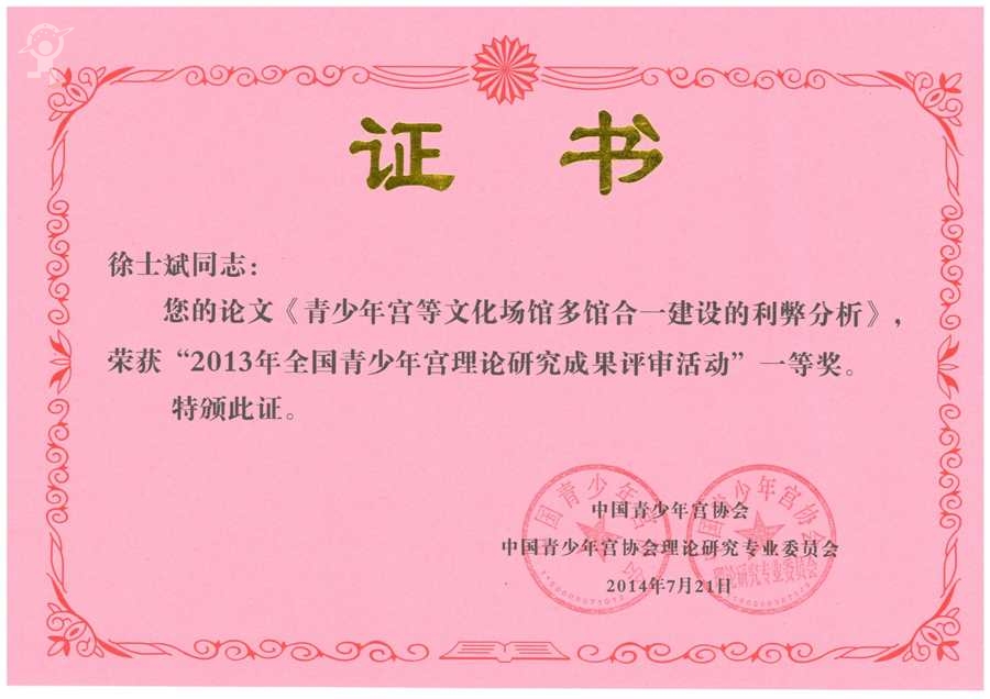 徐士斌《青少年宫等文化场馆多馆合一建设的利弊分析》论文荣获“2013年全国青少年宫理论研究成果评审活动”一等奖