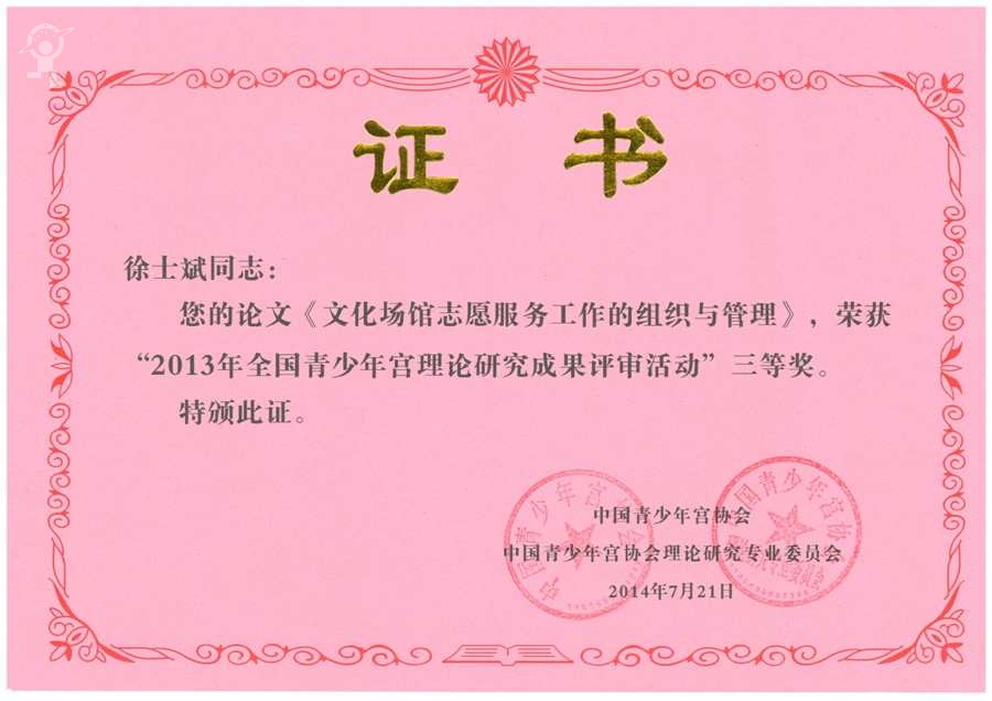 徐士斌《文化场馆志愿服务工作的组织与管理》论文荣获“2013年全国青少年宫理论研究成果评审活动”三等奖